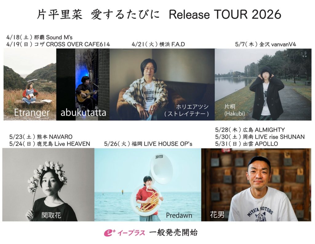 【日時】2026/5/23(土)【OPEN / START】OPEN 17時30分 START18時00分【場所】熊本NAVARO【料金】前売4,000円(ドリンク代別)【チケット発売】2/28(土)AM10時00分https://eplus.jp/katahirarina/【出演】片平里菜、関取花【Info】PROJECT FAMIRY 092-406-0855